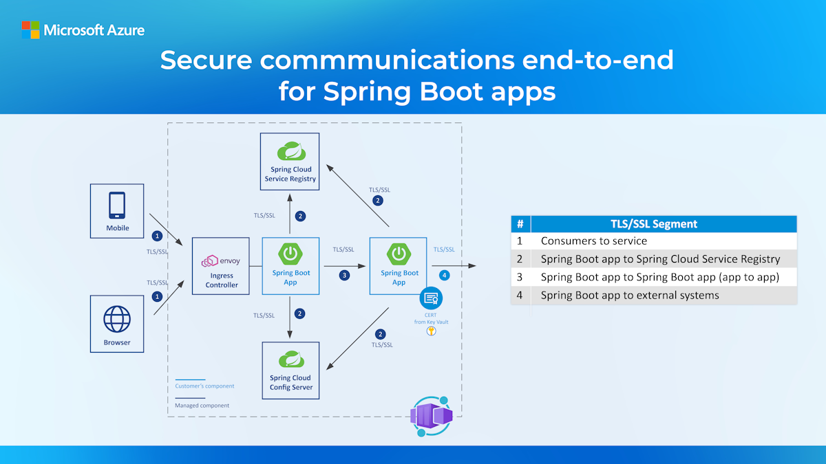 Java or Spring Boot apps can securely load certificates from Azure Key Vault (discussed next). With Azure Key Vault, you control the storage and distribution of certificates to reduce accidental leakage. Applications and services can securely access certificates using managed identities, role-based access control, and the principle of least privilege. This secure loading is powered using the Azure Key Vault JCA (Java Cryptography Architecture) Provider.