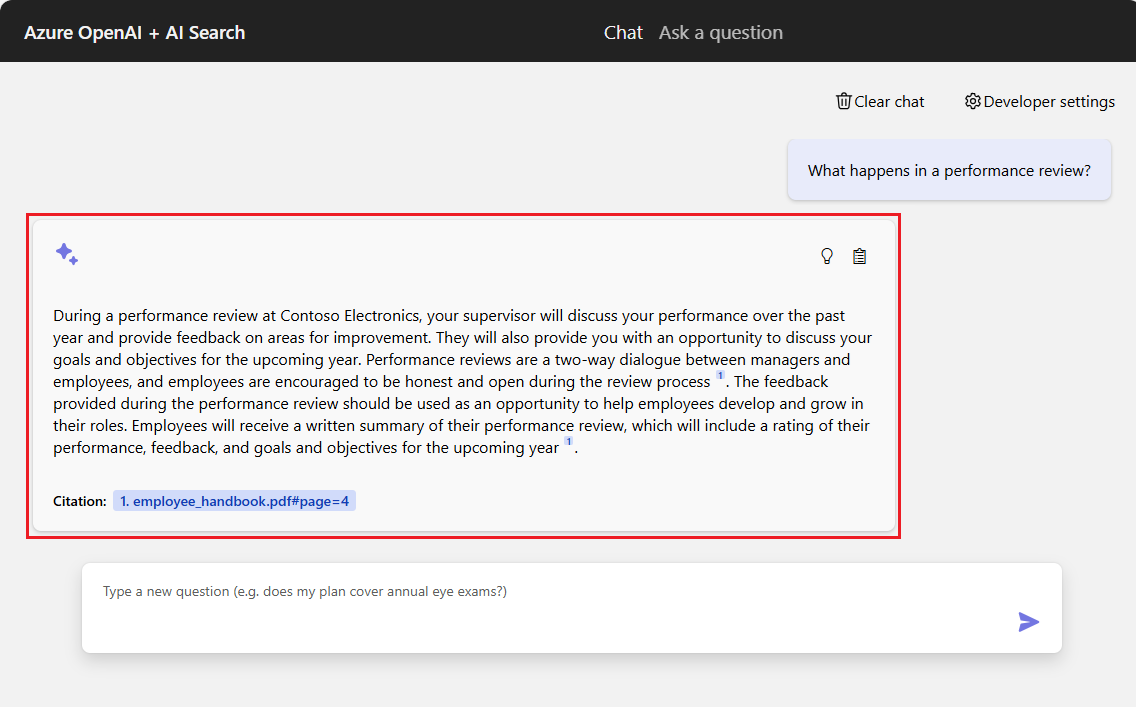 In the chat app, select the What happens in a performance review? option, or enter the same text in the chat text box. The app returns the initial response: