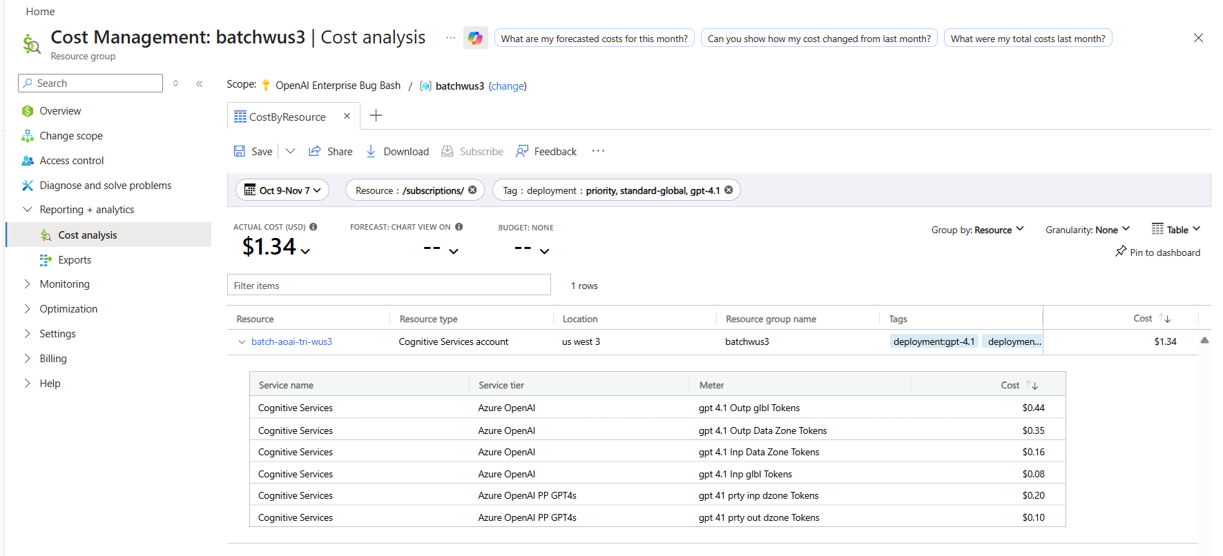 You can see a breakdown of costs for priority and standard requests in the Azure portal's cost analysis page by filtering on deployment name and billing tags as follows: