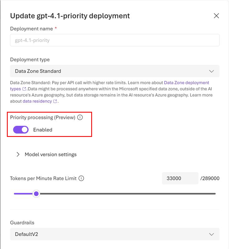 In the Microsoft Foundry portal, you can enable priority processing during deployment setup. Turn on the Priority processing (preview) toggle on the deployment details page when creating the deployment or update the setting of a deployed model by editing the deployment details.