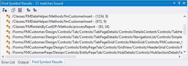 During build operations, cross-reference information is generated that can be used to show how elements are used. You can right-click an element and then click Find References to display a list of the locations where that element is used. When you click one of the items in the list, the designer for the element opens.