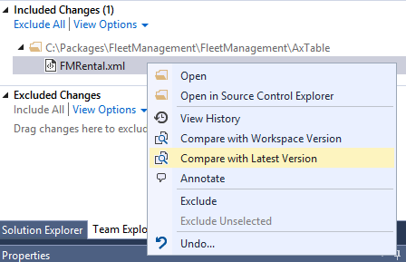 In Team Explorer, right-click FMRental.xml, and select Compare with Latest Version.