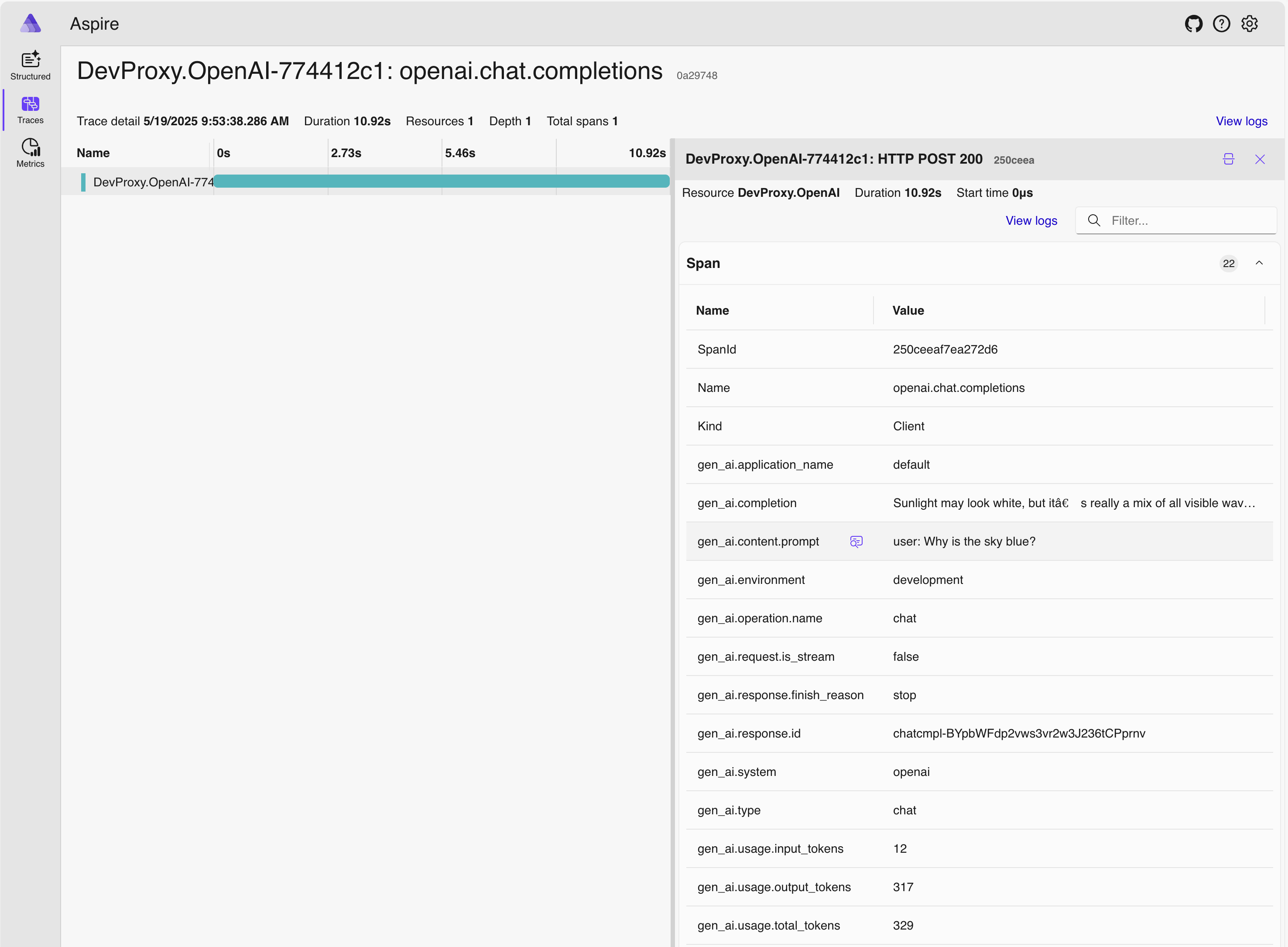 info Dev Proxy API listening on http://127.0.0.1:8897... info Dev Proxy listening on 127.0.0.1:8000... Hotkeys: issue (w)eb request, (r)ecord, (s)top recording, (c)lear screen Press CTRL+C to stop Dev Proxy req ╭ POST https://some-resource.cognitiveservices.azure.com/openai/deployments/some-deployment/chat/completions?api-version=2025-01-01-preview time │ 19/05/2025 07:53:38 +00:00 pass │ Passed through proc ╰ OpenAITelemetryPlugin: OpenTelemetry information emittedIn the web browser, navigate to the OpenTelemetry dashboard.