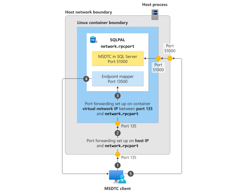 - The MSDTC client makes a connection directly to MSDTC by connecting to the host on port 51000, which is forwarded to SQL Server inside the container.