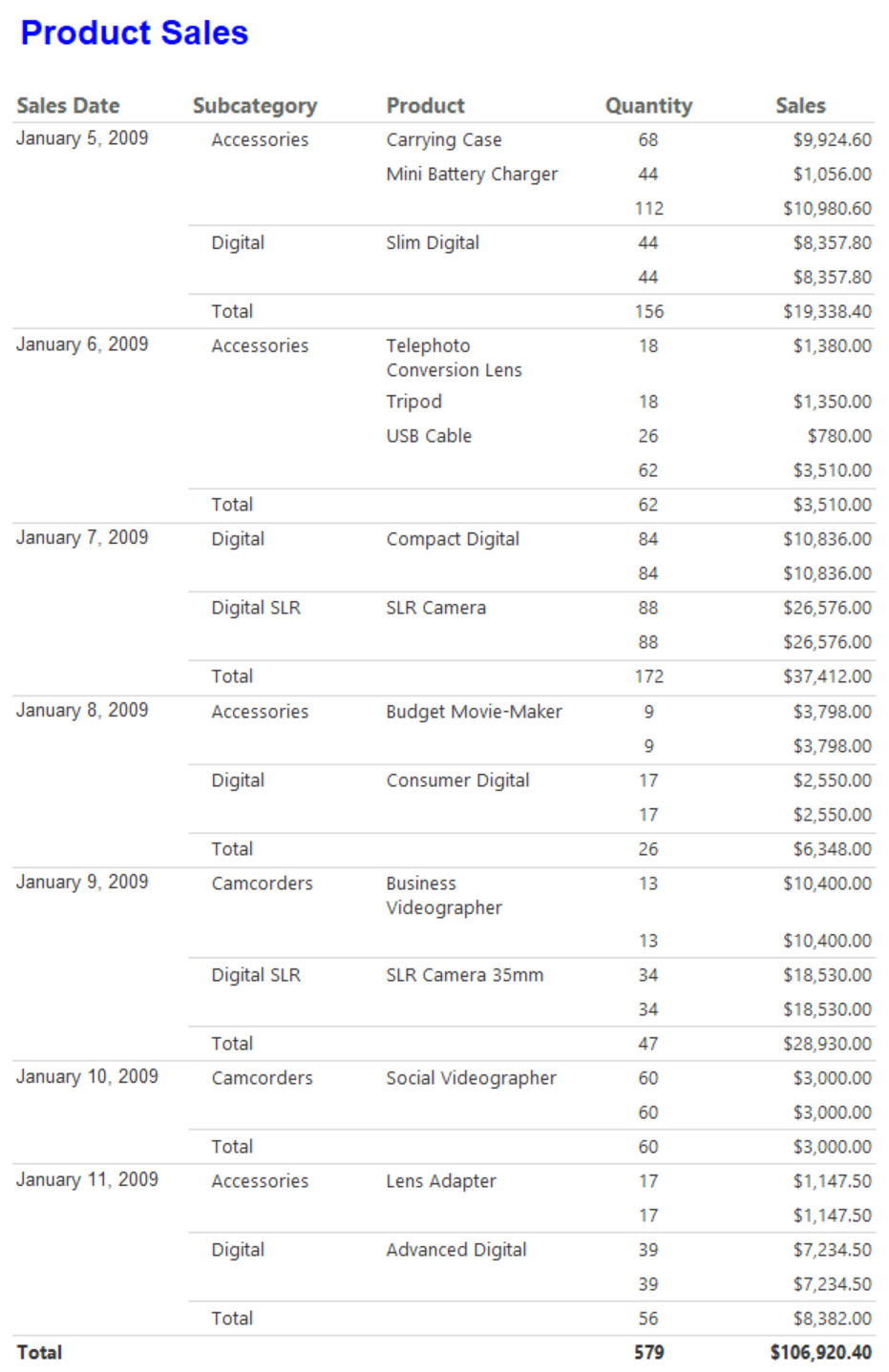 Confirm the summary values in the Sales column display as currency. Here's an example from the report: