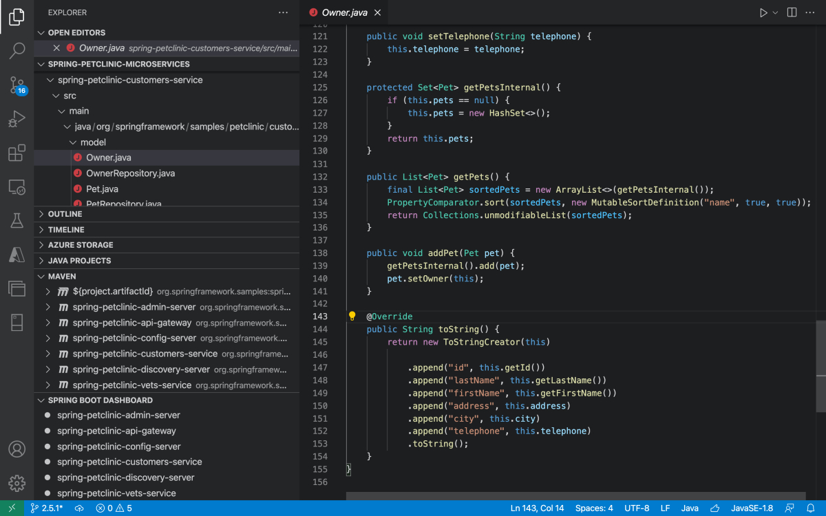 Visual Studio Code (VS Code) ist ein einfaches, agnostisches Betriebssystem, das unter Windows, macOS und Linux ausgeführt wird. Als leistungsstarke IDE bietet es ein umfassendes Toolset für die Java-Entwicklung. Es unterstützt jedes Java Development Kit (JDK), einschließlich des Microsoft Builds von OpenJDK, Amazon Corretto, Eclipse Adoptium und Oracle Java SE. VS Code ist auch gut in alle Java-Frameworks, Anwendungsserver und andere beliebte Tools integriert, darunter Tomcat, Spring Boot, JBoss EAP, WildFly, Quarkus, Open Liberty, Maven und Gradle. Dazu unterstützt es andere Programmiersprachen, die häufig von Java-Entwicklern verwendet werden – z. B. JavaScript und SQL.