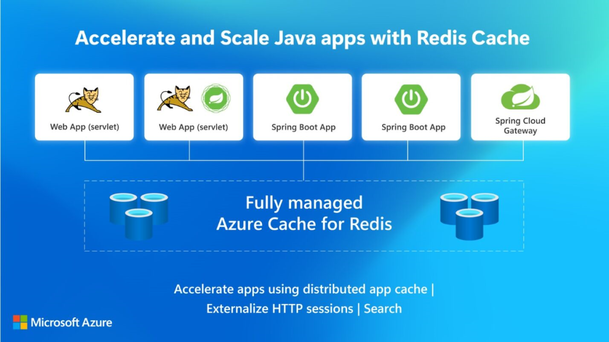 Wenn die Workloads für Ihre Java-Anwendungen zunehmen, können Sie die Leistung steigern, indem Sie Azure Cache for Redis verwenden, um eine In-Memory-Zwischenspeicherungsebene für Abfrageergebnisse, Sitzungszustände und statische Inhalte zu implementieren. Dies ist eine hervorragende Möglichkeit, den Anwendungsdurchsatz zu verbessern und die Latenz zu reduzieren, ohne die zugrunde liegende Datenbank neu erstellen zu müssen. Azure Cache for Redis Enterprise-Ebenen, die in Partnerschaft mit Redis entwickelt und vollständig von Microsoft verwaltet werden, stellen eine höchst verfügbare und skalierbare Bereitstellungsoption für die Ausführung von Redis auf Azure dar – einschließlich Features wie aktive Georeplikation, externalisierte Sitzungsverwaltung und schnelle Suche und Indizierung.
