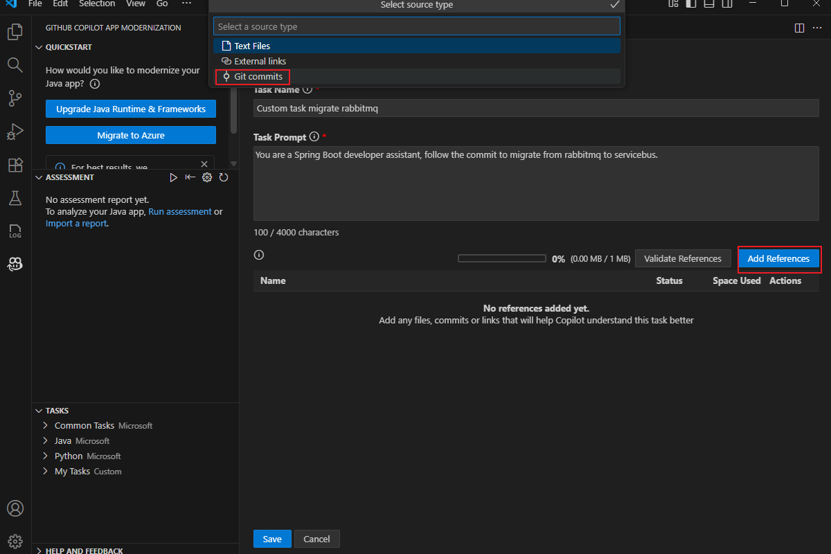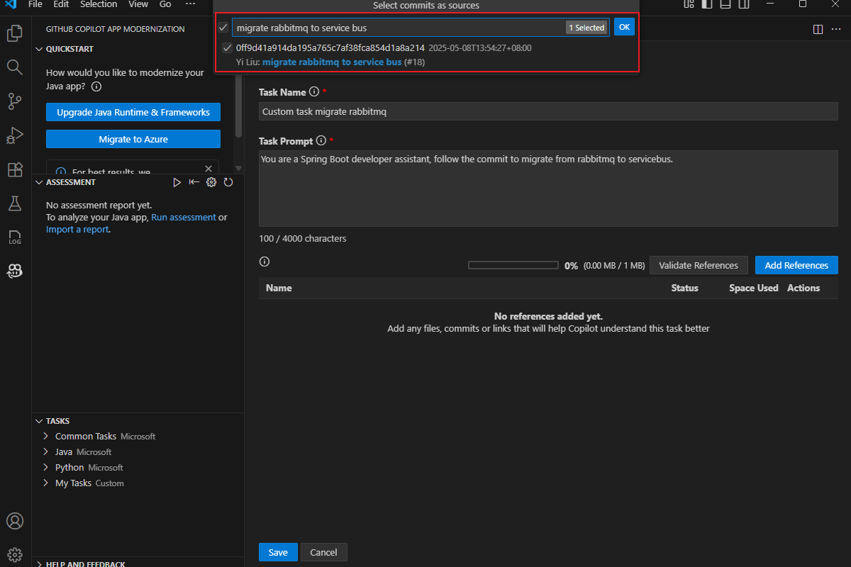 task.mdDatei wird geöffnet. Geben Sie im Feld "Vorgangsname" die Zeichenfolge "Custom task migrate RabbitMQ" ein. Geben Sie im Feld „Task Prompt“„Sie sind ein Assistent für Spring Boot-Entwickler, folgen Sie dem Commit, um von RabbitMQ zu Servicebus zu migrieren.“ ein.Wählen Sie "Verweise hinzufügen" und dann "Git Commits " im Popupdialogfeld aus.