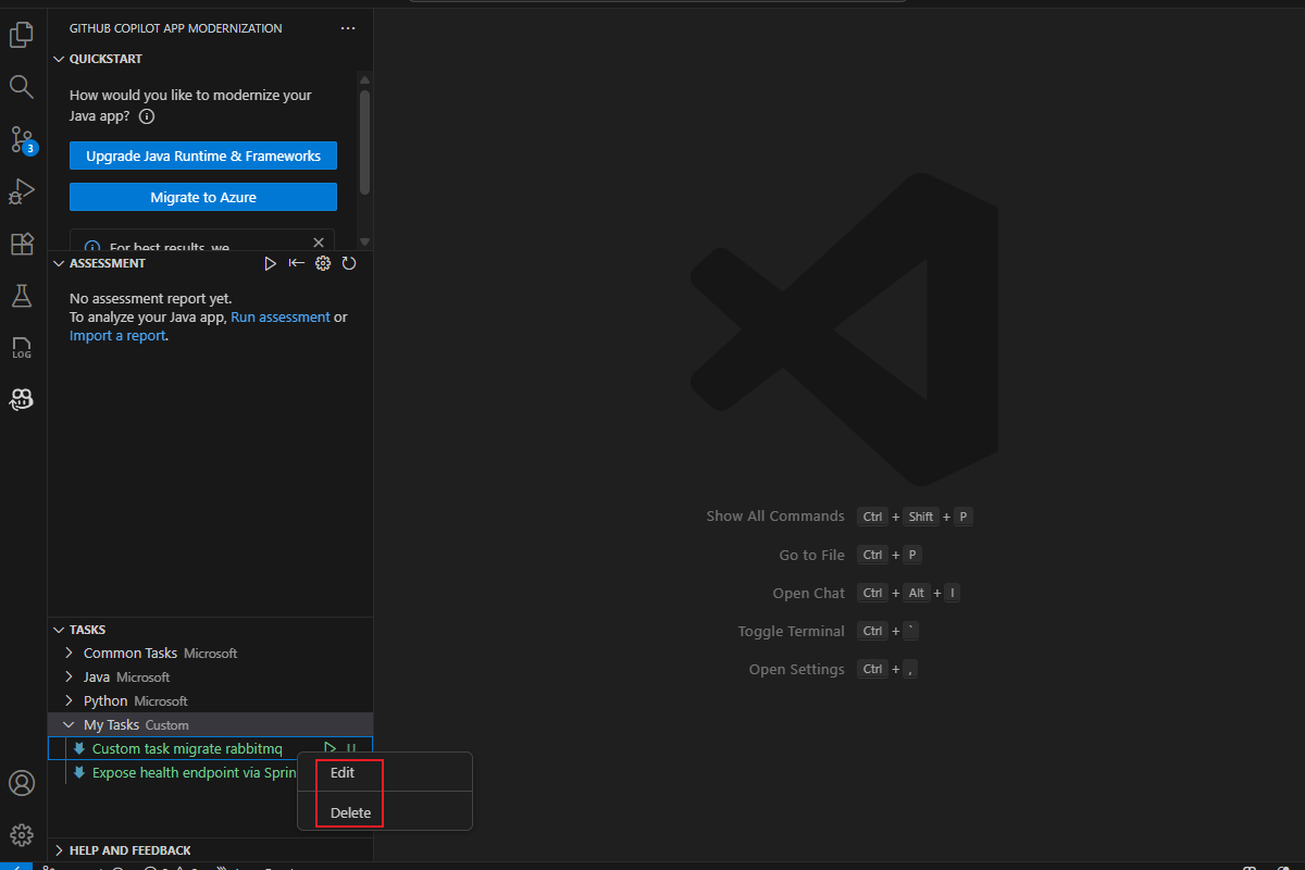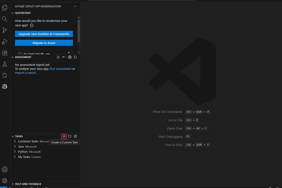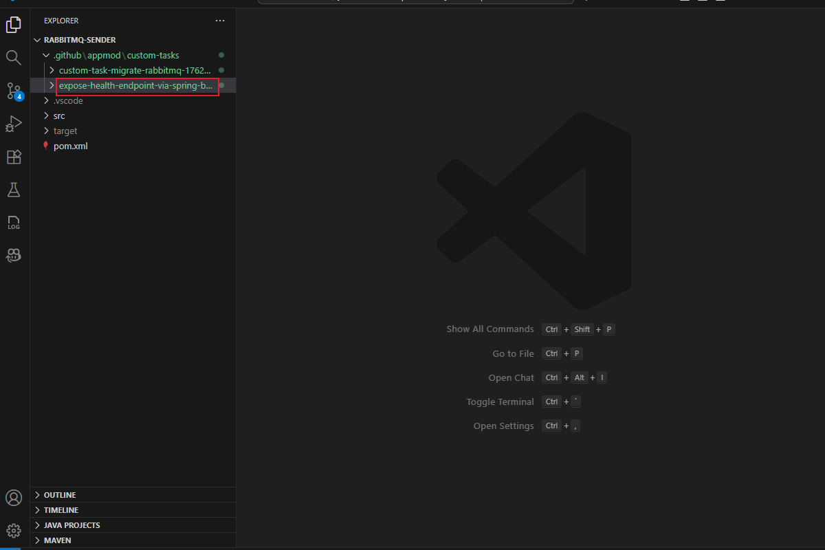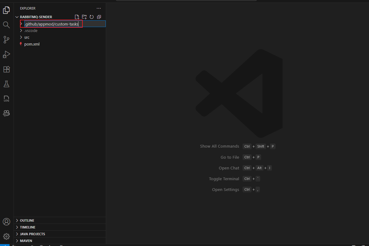rabbitmq-senderProjektordner aus dem geklonten Repository. Wechseln Sie dann zum Quellzweig .Öffnen Sie in der Aktivitäts-Randleiste den Erweiterungsbereich der GitHub Copilot-App-Modernisierung, zeigen Sie auf den Abschnitt AUFGABEN, und wählen Sie dann "Benutzerdefinierte Aufgabe erstellen" aus.