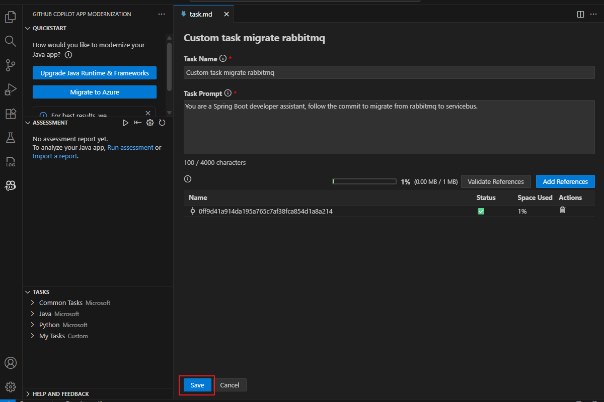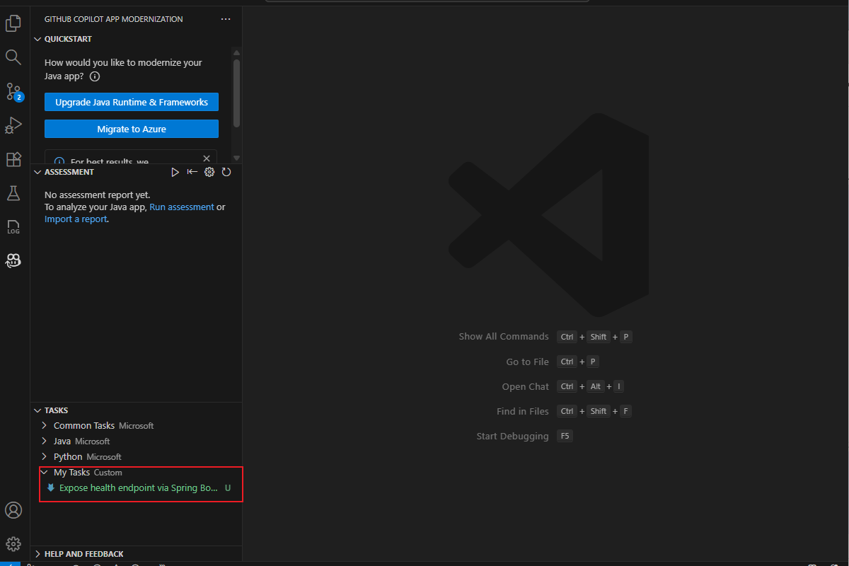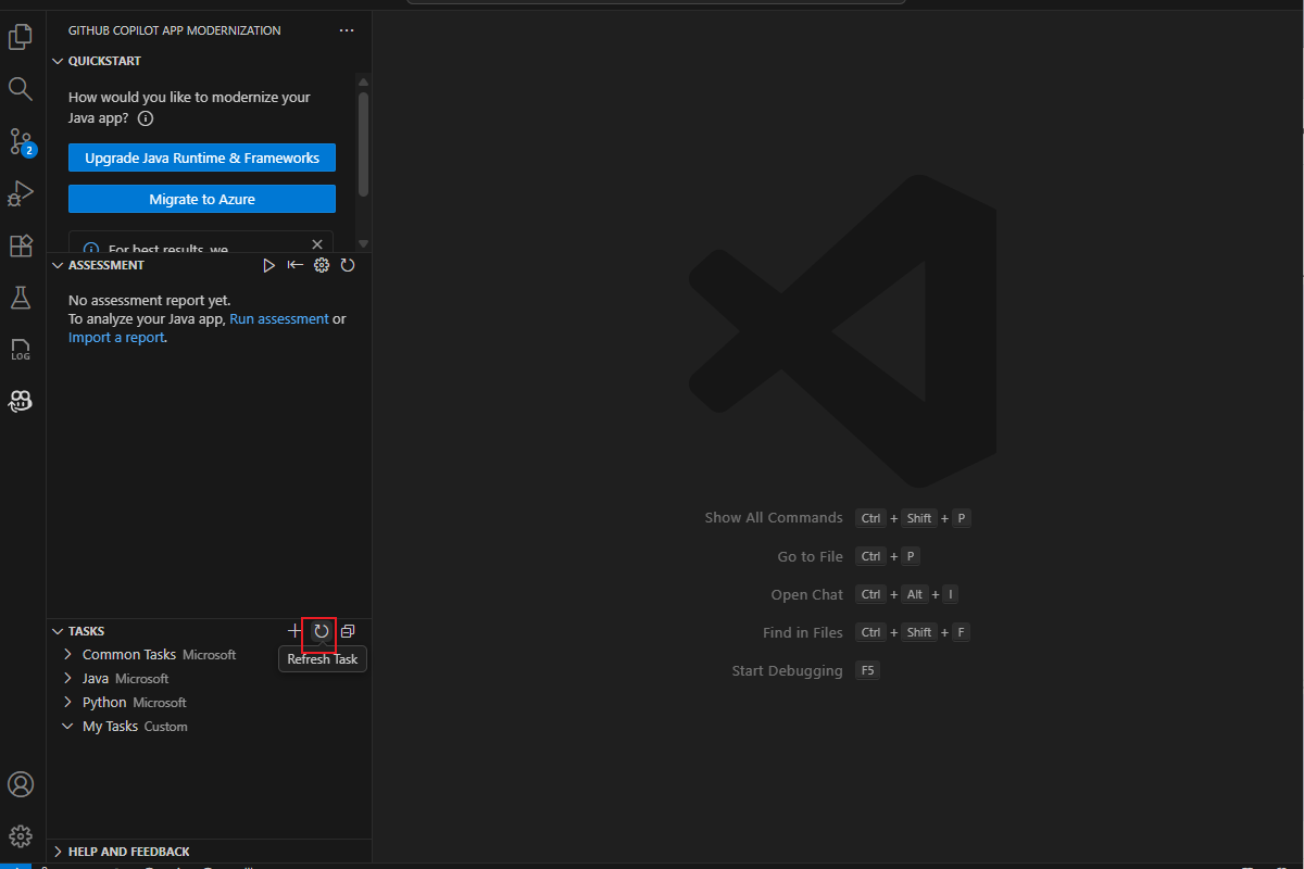 task.mdDatei, indem Sie die vordefinierten Schritte in der GitHub Copilot-App-Modernisierungserweiterung ausführen.Geben Sie in der geöffneten