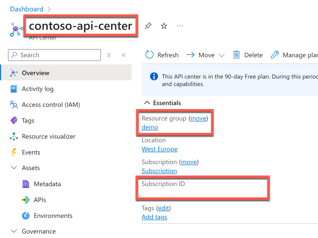Kopieren Sie auf der Seite „Übersicht“ der Azure API Center-Instanz den Namen der API Center-Instanz sowie den Namen der Ressourcengruppe und die Abonnement-ID. Diese Informationen benötigen Sie, um ApiCenterOnboardingPlugin so zu konfigurieren, dass eine Verbindung mit Ihrer Azure API Center-Instanz hergestellt werden kann.
