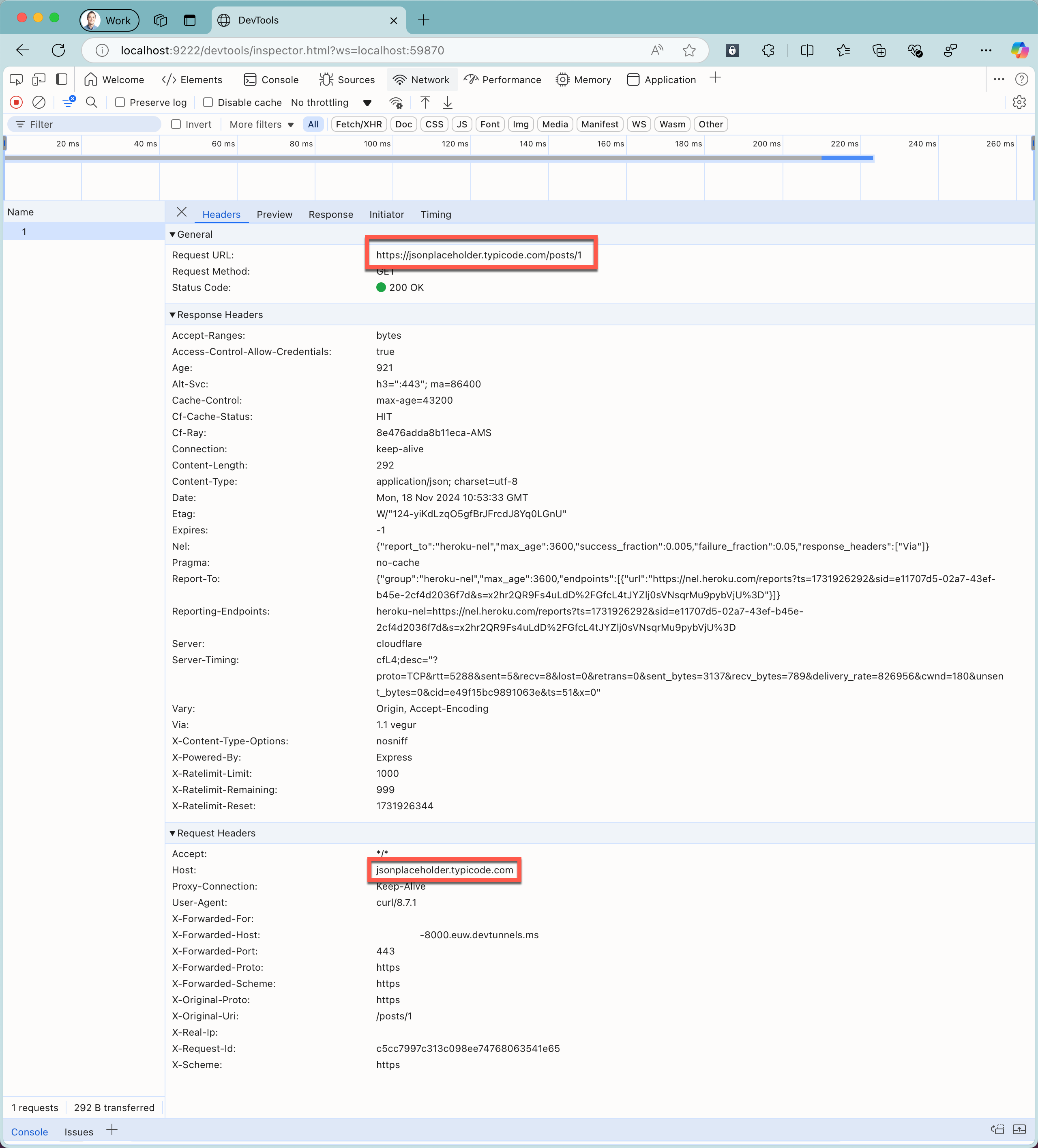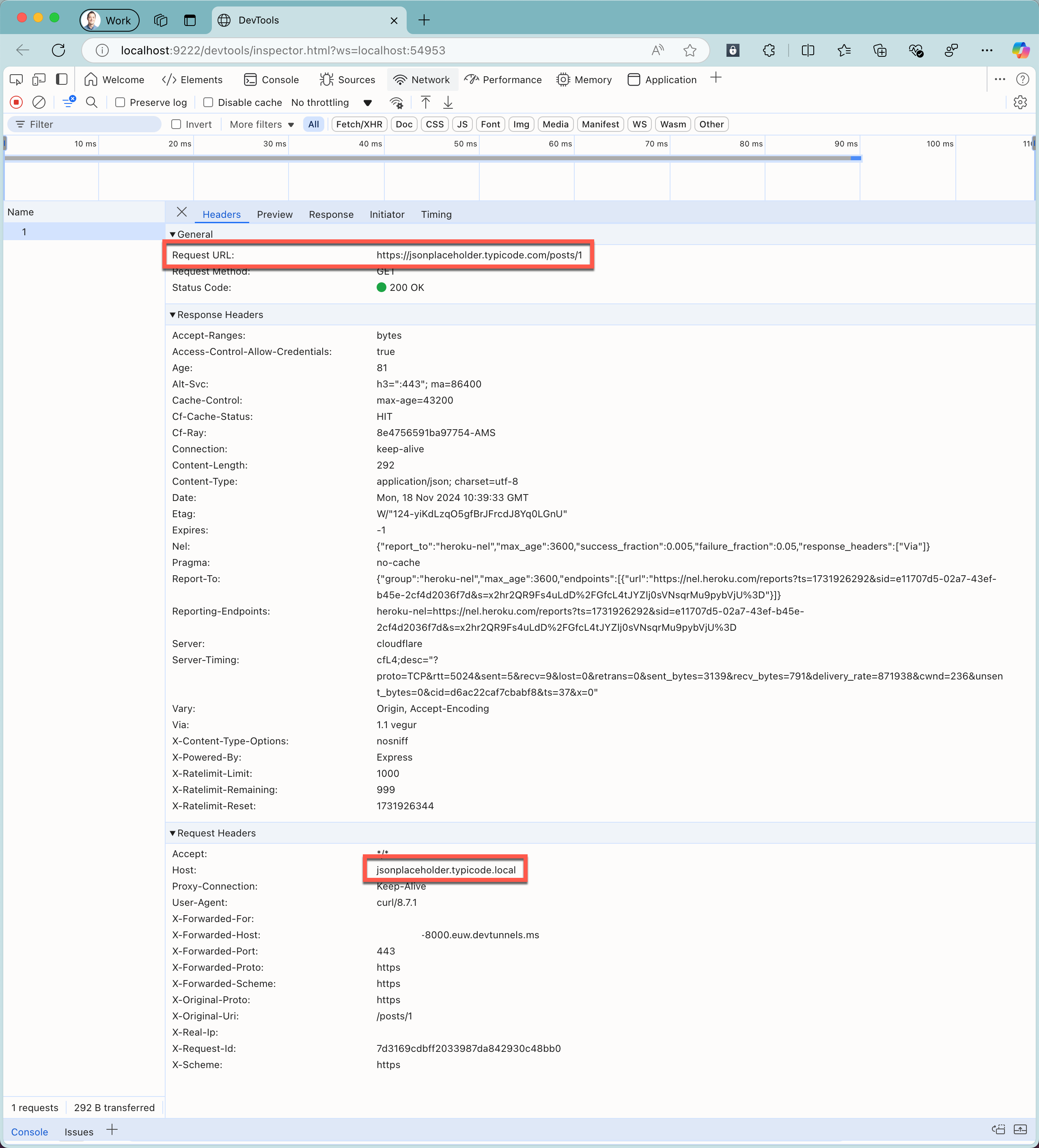 curl https://tunnel_id-8000.euw.devtunnels.ms/posts/1ausführen.Beachten Sie im Webbrowser mit Chrome Dev Tools die Informationen zur abgefangenen Anforderung und die Antwort von der Cloud-API.