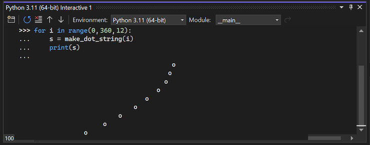 for i in range(360): s = make_dot_string(i) print(s)Die mehrzeilige Einfügeaktion ist in der REPL-Oberfläche der Python-Befehlszeile schwer zu erledigen. Nachdem Sie den Code eingefügt haben, führt das interaktives Fenster den Code so aus, als ob Sie ihn direkt im Fenster eingegeben haben: