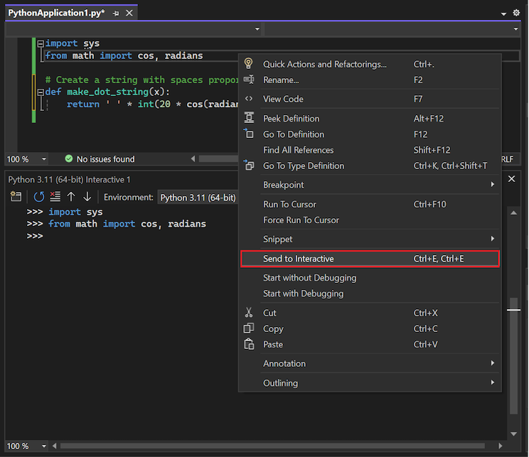 import-Anweisung in der Datei, und wählen Sie An Interactive senden (oder verwenden Sie die Tastenkombination STRG+E). Wiederholen Sie diesen Vorgang für diefrom-Anweisung.Wenn Sie den Befehl An Interactive senden auswählen, wird das ausgewählte Codefragment sofort in das Interactive-Fenster eingefügt und ausgeführt. In diesem Fall importiert Visual Studio die