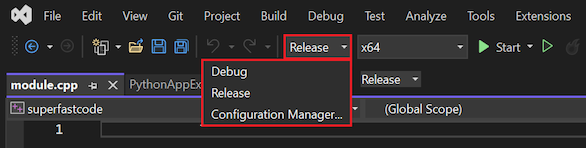 - Ändern Sie für das C++-Projekt (Superfastcode oder Superfastcode2) die Zielkonfiguration entsprechend Ihrer Python-Installation. Wenn ihre C++-Projektzielkonfiguration beispielsweise Win32 ist, ihre Python-Installation jedoch 64-Bit ist, ändern Sie die C++-Projektzielkonfiguration in x64.