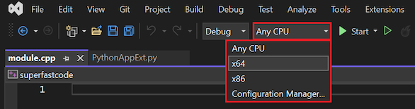 - Aktivieren Sie für eine 64-Bit-Python-Laufzeit die x64-Konfiguration .