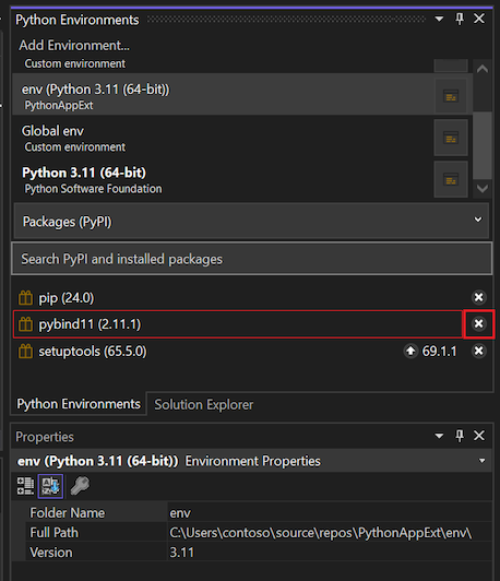 pipBefehl in der Python-Umgebung ausführen, die für Ihr Python-Projekt aktiviert ist. Wenn Sie die aktive Python-Umgebung für Ihr Projekt im Projektmappen-Explorer erweitern, sollte ein Eintrag für das C++-Projekt angezeigt werden, z. B. Superfastcode.