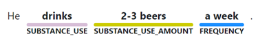 SUBSTANCE_USE_AMOUNT – Mentions of specific amounts of substance use. For example, a pack (of cigarettes) or a few glasses (of wine).
