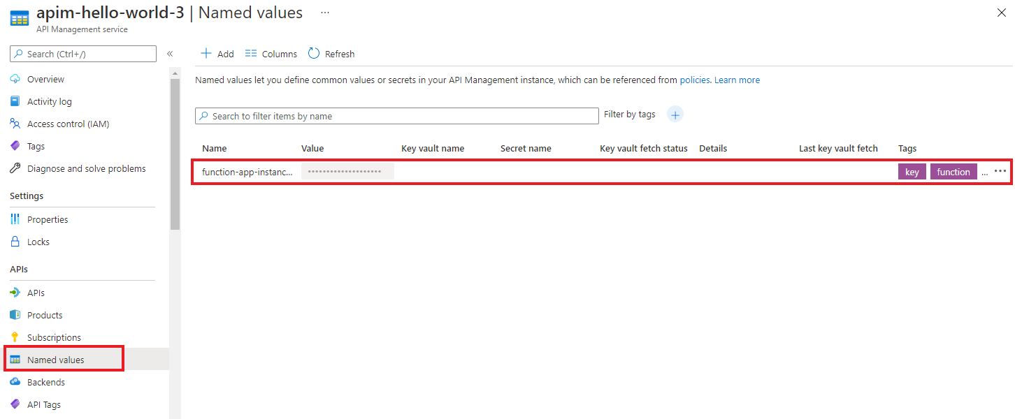 Navigate to your API Management instance and select APIs > Named values in the left pane. The Azure function app key is stored there.