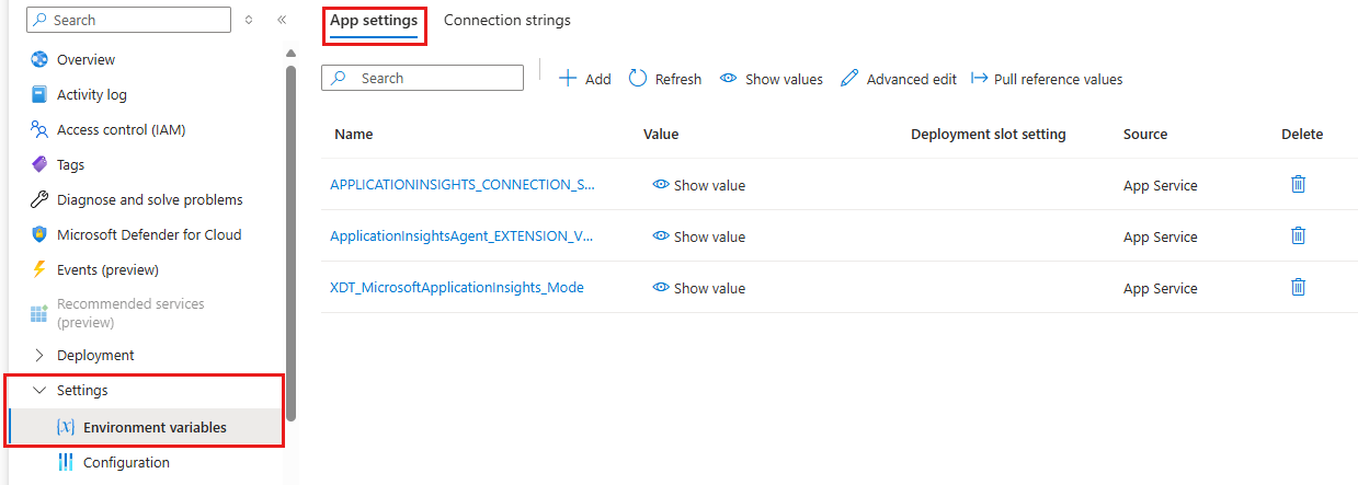 On the app's left menu, select Settings > Environment variables. Then select App settings.