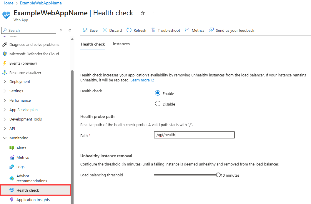 After providing your application's Health check path, you can monitor the health of your site by using Azure Monitor. From the Health check page in the portal, select Metrics in the toolbar. Doing so opens a new page where you can see the site's Health check status history and create a new alert rule. The Health check status metric aggregates the successful pings and displays failures only when the instance is deemed unhealthy based on the Health check load balancing Threshold value that's configured. By default, this value is set to 10 minutes, so it takes 10 consecutive pings (1 per minute) for a given instance to be deemed unhealthy, and only then will it be reflected on the metric. For more information on monitoring your sites, see Azure App Service quotas and metrics.