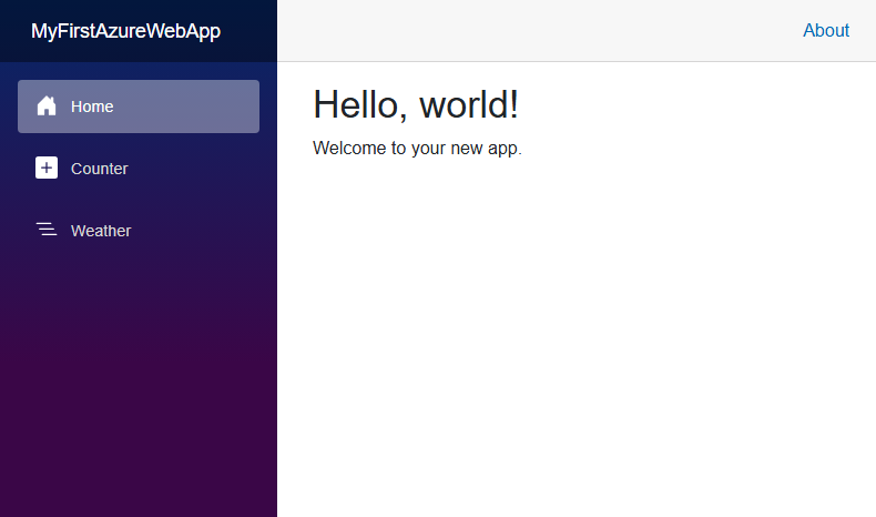 dotnet new blazor -n MyFirstAzureWebApp --framework net10.0 cd MyFirstAzureWebAppFrom the same terminal session, run the application locally using the dotnet run command.