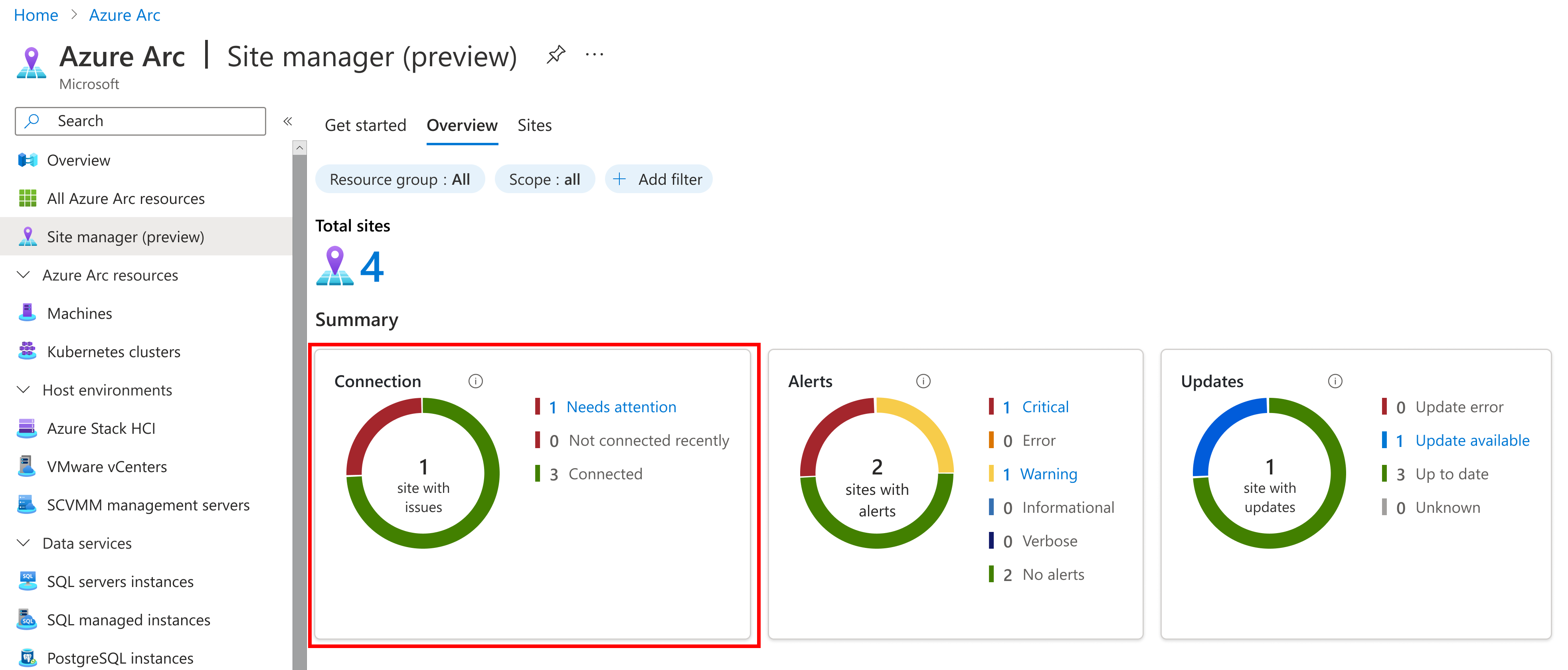 You can view connectivity status for an Arc site as a whole from the main page of Azure Arc site manager (preview).