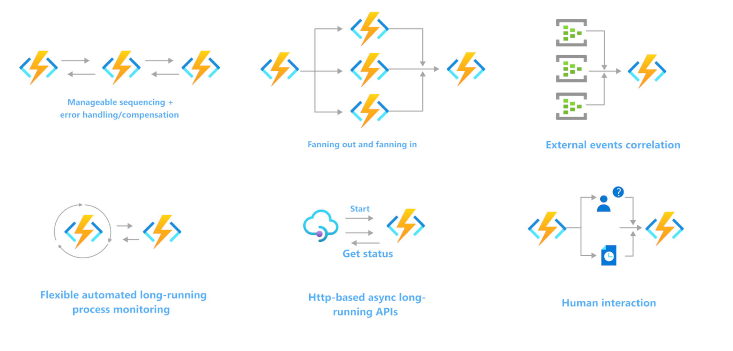 Functions often serve as the compute component in a serverless workflow topology, such as a Logic Apps workflow. You can also create long-running orchestrations by using the Durable Functions extension. For more information, see Durable Functions overview.