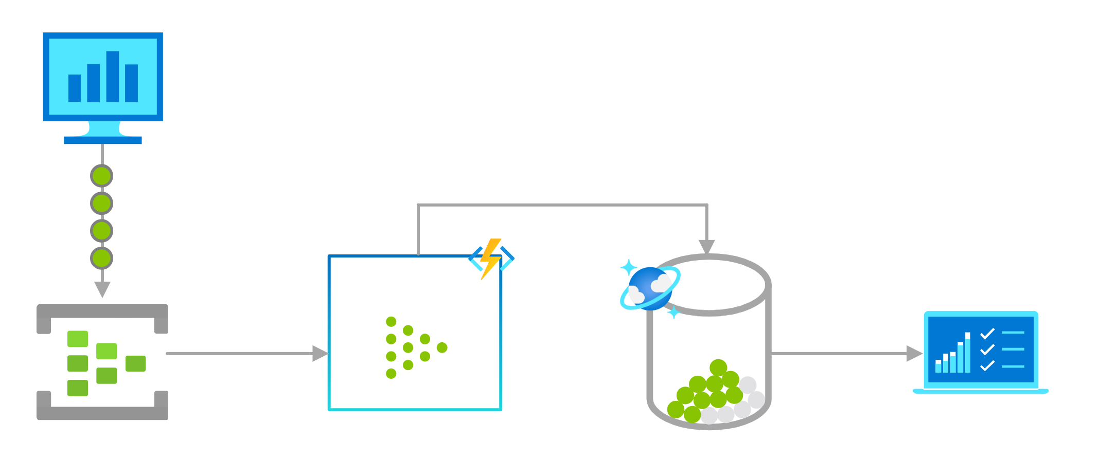 Cloud applications, IoT devices, and networking devices generate and collect a large amount of telemetry. Azure Functions can process that data in near real-time as the hot path, then store it in Azure Cosmos DB for use in an analytics dashboard.