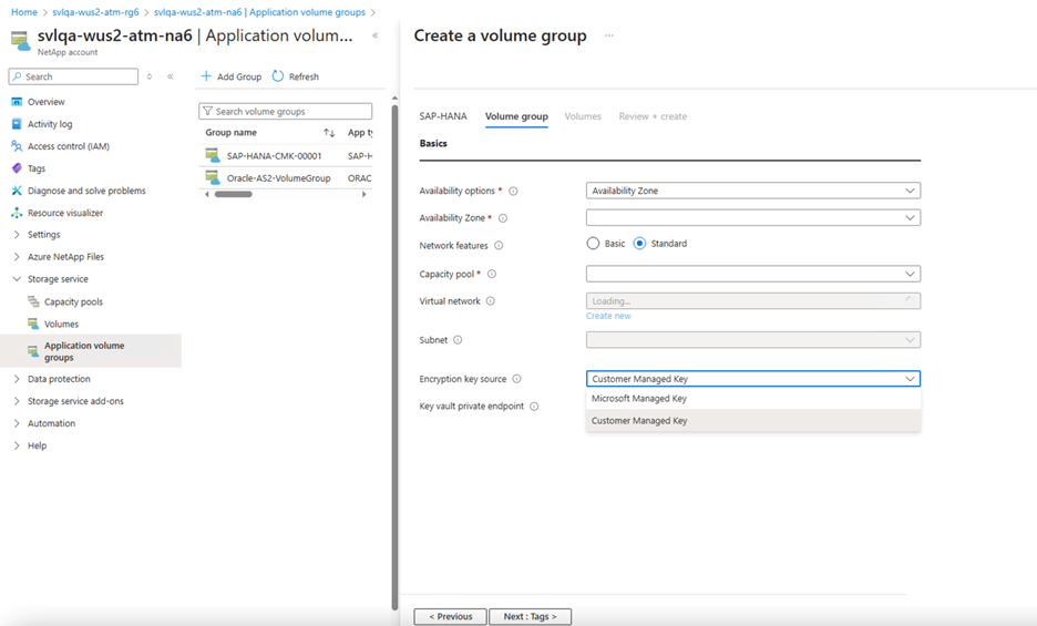 All volumes are placed in a single manual QoS capacity pool. If you want to create the log-backup and data-backup volumes in a separate capacity pool, you can choose not to add those volumes to the volume group.Virtual network: