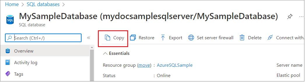 To copy a database by using the Azure portal, open the page for your database, and then choose Copy to open the Create SQL Database - Copy database page. Fill in the values for the target logical server where you want to copy your database to.