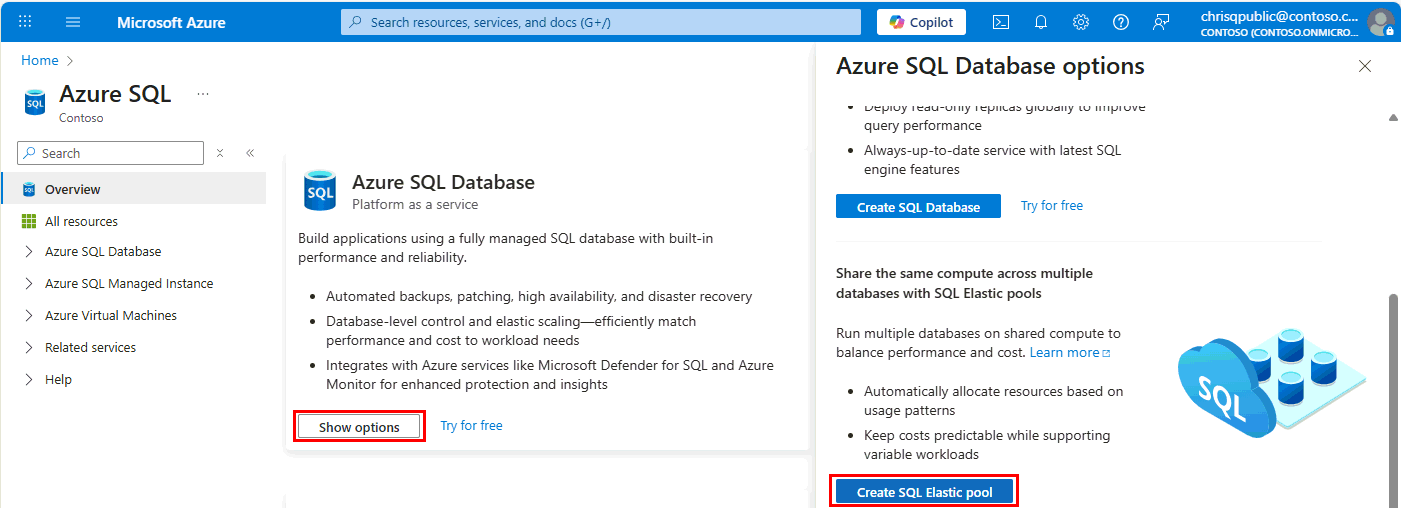 In the Azure SQL Database options window, select Create SQL Elastic pool.