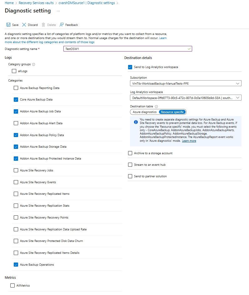 In the monitoring section of your Recovery Services vault, select Diagnostics settings and specify the target for the Recovery Services vault's diagnostic data. To learn more about using diagnostic events, see Use diagnostics settings for Recovery Services vaults.