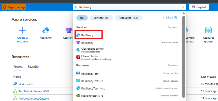 Search for Resiliency, and then go to the Resiliency dashboard.