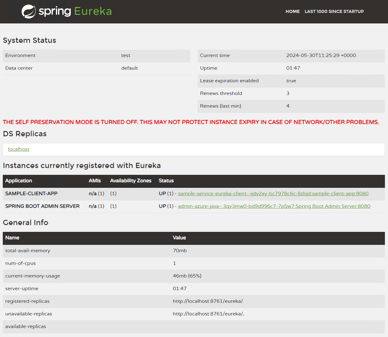 Since the previous steps bound the Admin for Spring component to the Eureka Server for Spring component, the Admin component enables service discovery and allows you to manage it through the Admin for Spring dashboard at the same time.