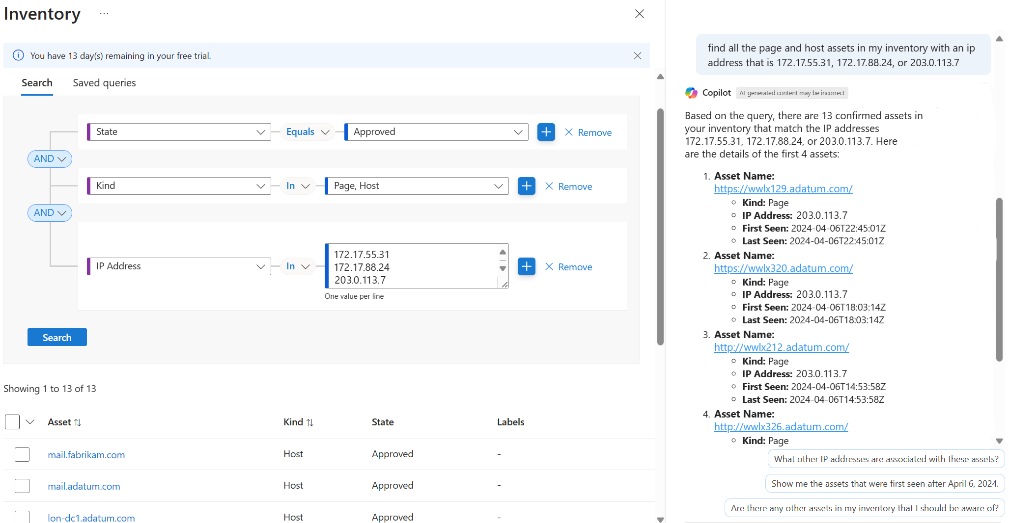You can use a natural language query to better understand your attack surface. In this example, the query is "find all the page and host assets in my inventory with an ip address that is (list of IP addresses)". Azure Copilot queries your Defender EASM inventory and provides details about the assets matching your criteria. You can then follow up with additional questions as needed.