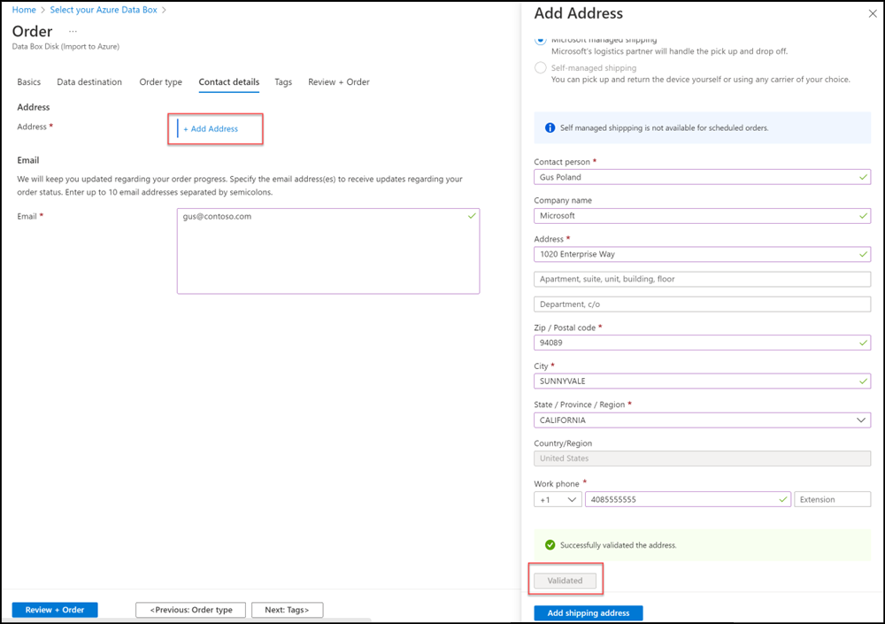 In the Contact details tab, select Add address and enter the address details. Select Validate address. The service validates the shipping address for service availability. If the service is available for the specified shipping address, you receive a notification to that effect.