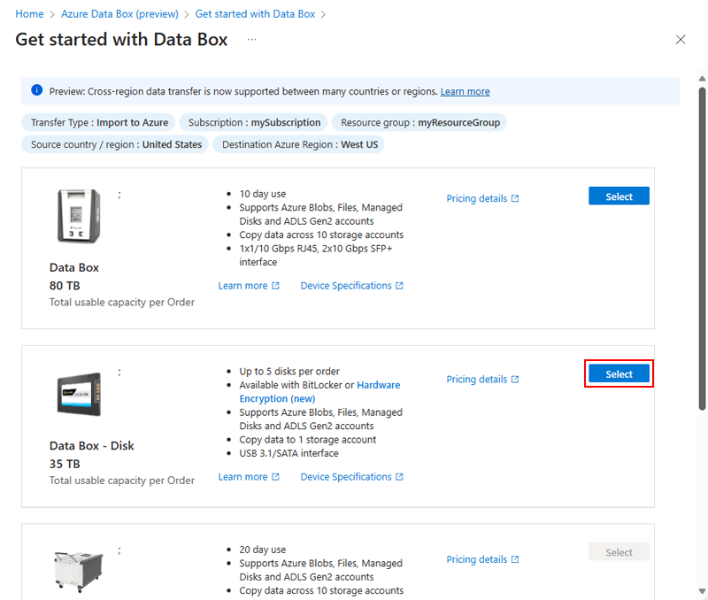 A resource group is a logical container for the resources that can be managed or deployed together.Source country/region Select the country/region where your data currently resides. Destination Azure region Select the Azure region where you want to transfer data. Select Data Box Disk. The maximum capacity of the solution for a single order of five disks is 35 TB. You could create multiple orders for larger data sizes.