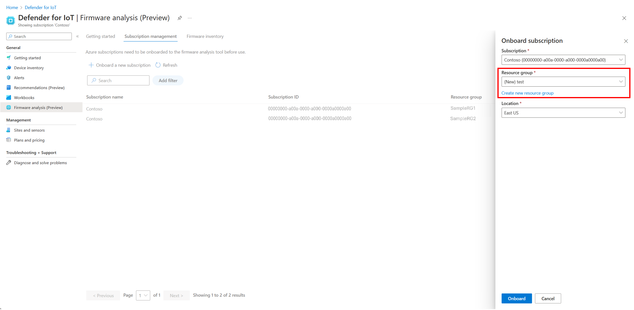 User choice in resource group: Pick your own resource group or create a new resource group to use Defender for IoT Firmware Analysis during the onboarding process.