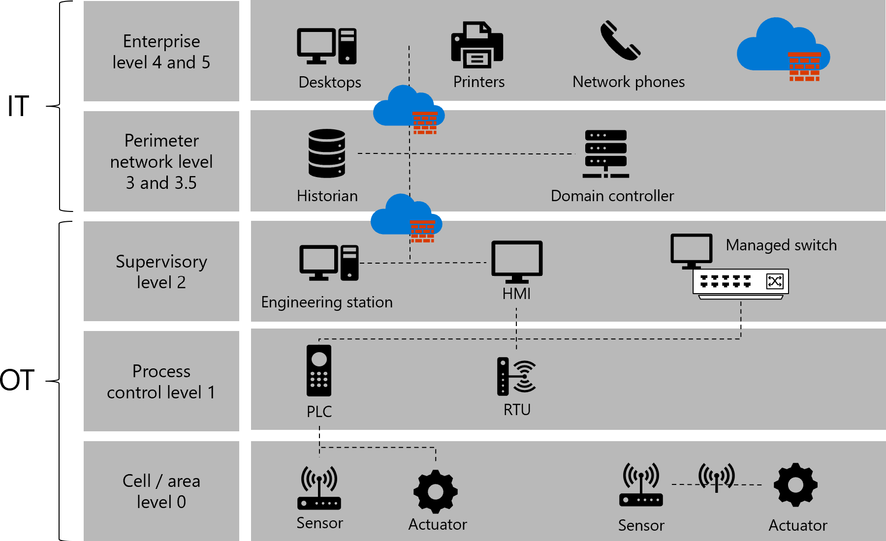 | Levels 4 and 5: Business and enterprise networks | Level 4 and Level 5 represent the site or enterprise network where the centralized IT systems and functions exist. The IT organization directly manages the services, systems, and applications at these levels. |