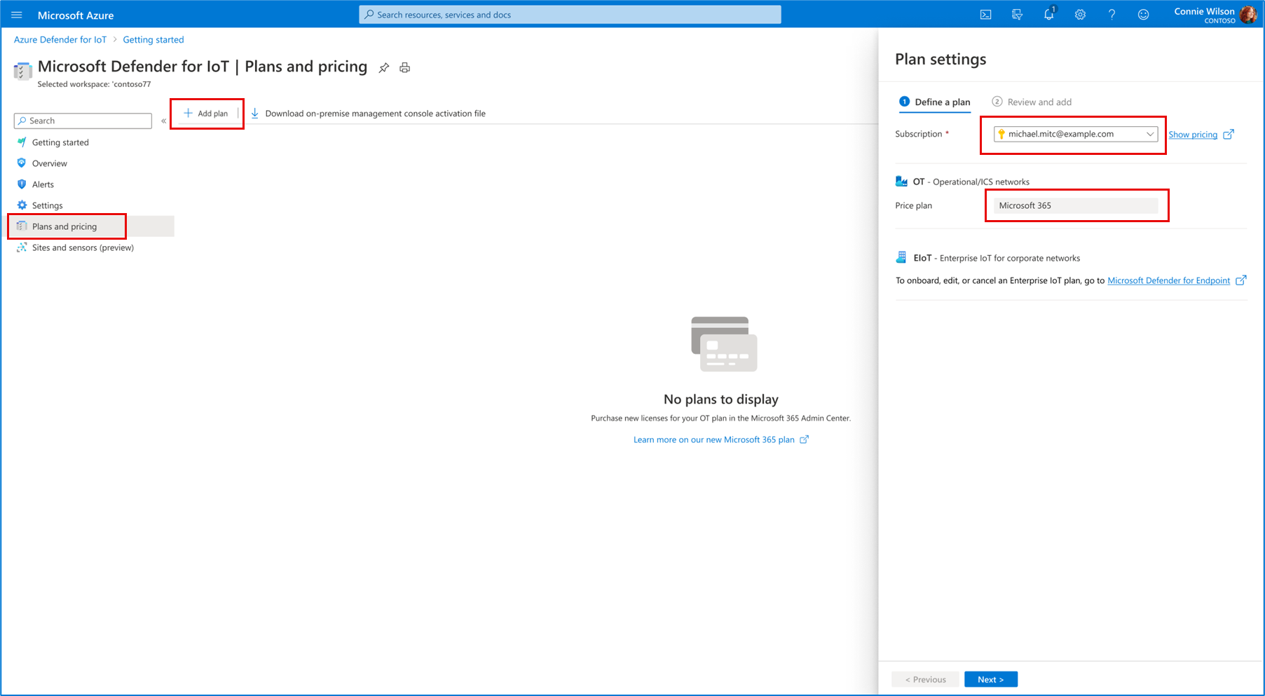 Back in the Defender for IoT's Plans and pricing page, select Add plan. In the Plan settings pane, select your new subscription.