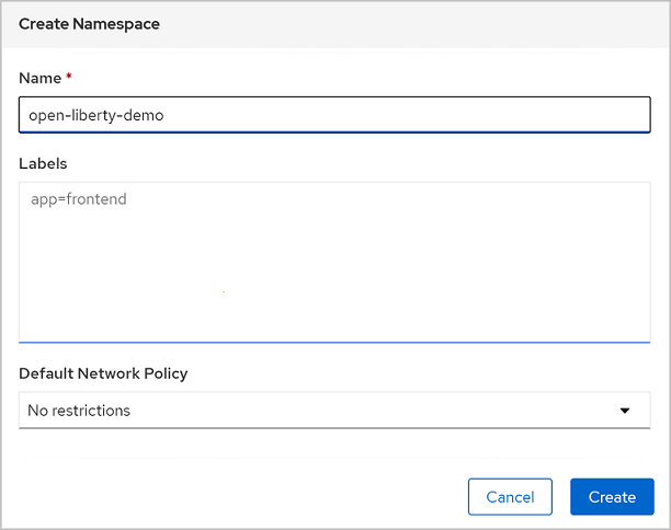 For Name, fill in open-liberty-demo, and then select Create, as shown in the following screenshot.