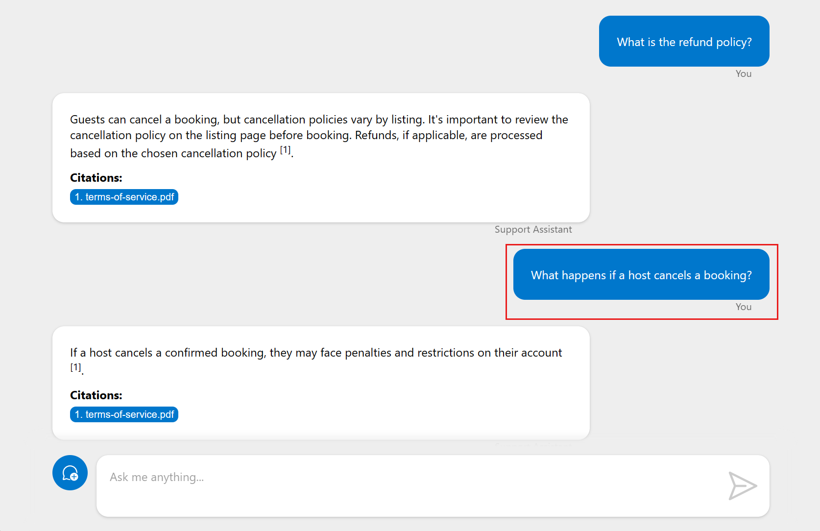 Select the citation in the response to view the source document. Azure Storage delivers the document to your browser. When you finish reviewing the document, close the tab to return to the chat app.