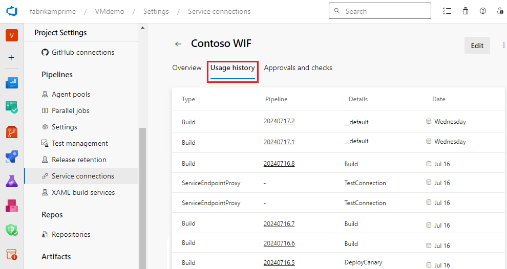 The Usage history tab shows details about historical usage of the service connection.