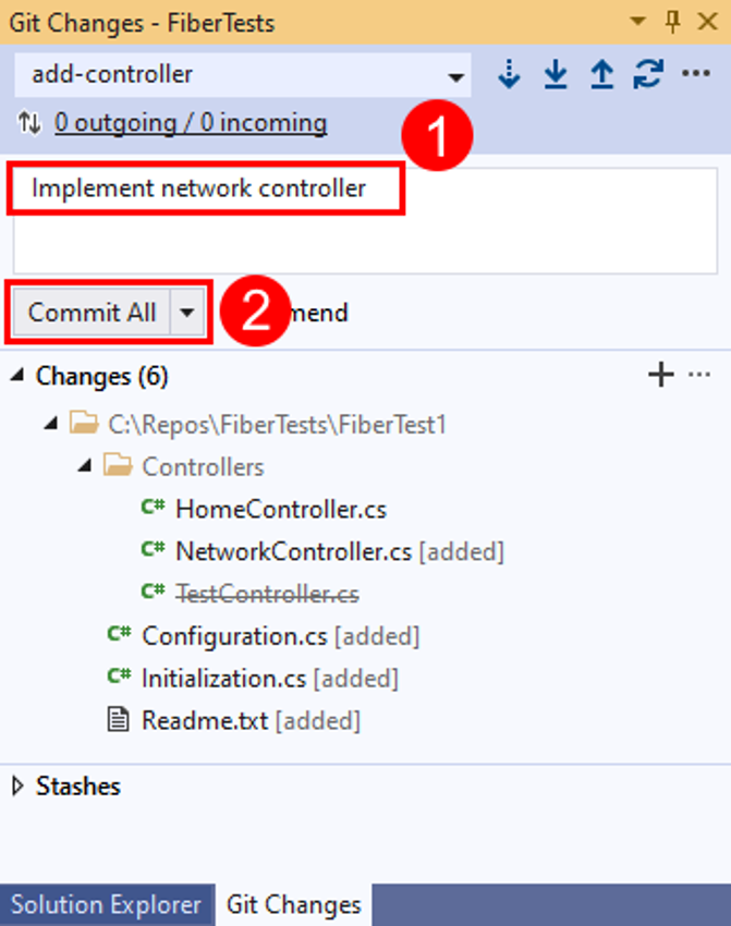 In the Git Changes window, enter a message that describes your staged changes and then select Commit Staged.