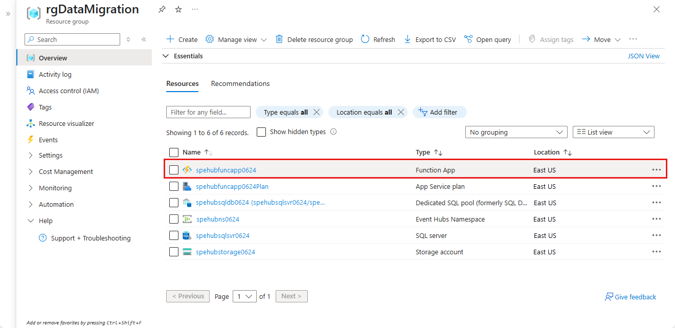 az deployment group create \ --resource-group rgDataMigration \ --template-uri https://raw.githubusercontent.com/Azure/azure-docs-json-samples/master/event-grid/EventHubsDataMigration.json \ --parameters eventHubNamespaceName=<event-hub-namespace> eventHubName=hubdatamigration sqlServerName=<sql-server-name> sqlServerUserName=<user-name> sqlServerPassword=<password> sqlServerDatabaseName=<database-name> storageName=<unique-storage-name> functionAppName=<app-name>Press Enter in the Cloud Shell window to run the command. This process might take a while since you're creating a bunch of resources. In the result of the command, ensure that there are no failures.