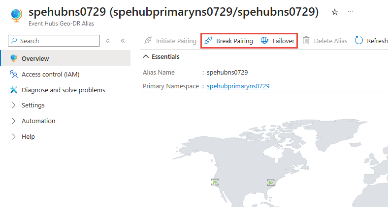 Screenshot that shows the Break Pairing and Failover menus on the Event Hubs Geo-DR Alias page.