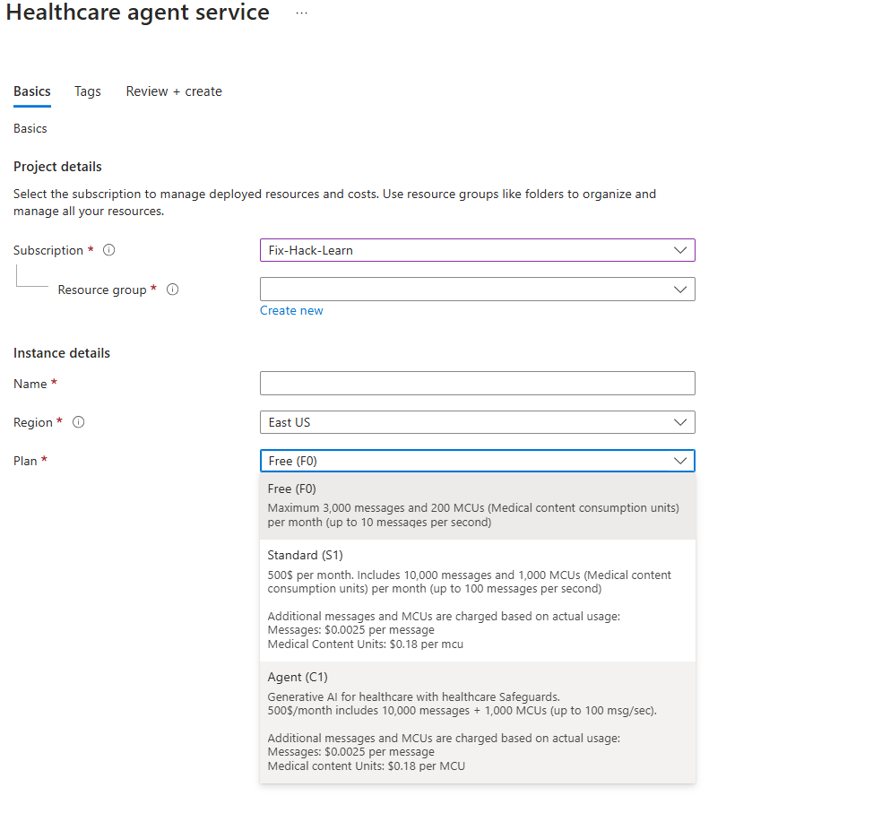 Follow the steps in the resource creation wizard and provide the required details for your new healthcare agent service resource. It's important to select the Agent Tier to have access to the Copilot Studio Connector.