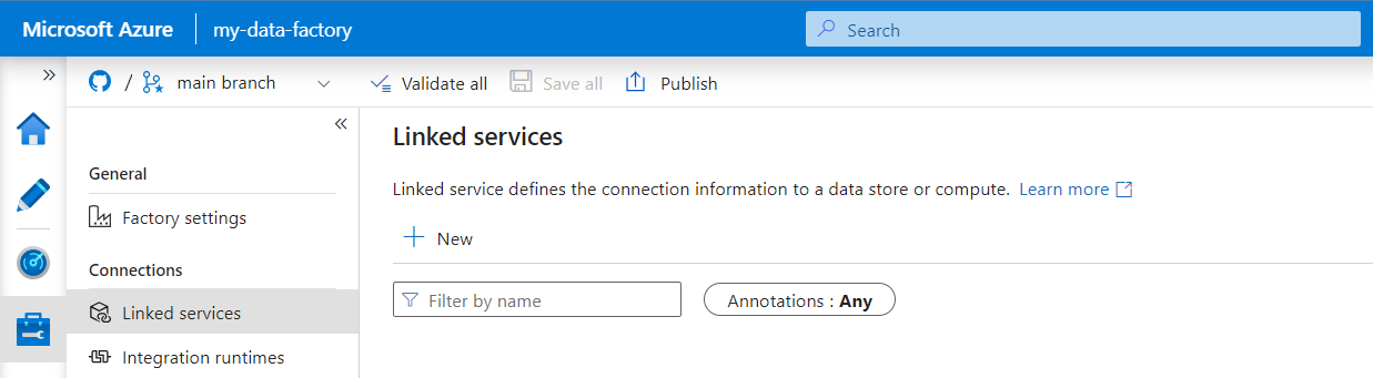 In Azure Data Factory Studio, select Manage from the menu on the left. Under Connections, select Linked services and then select New.