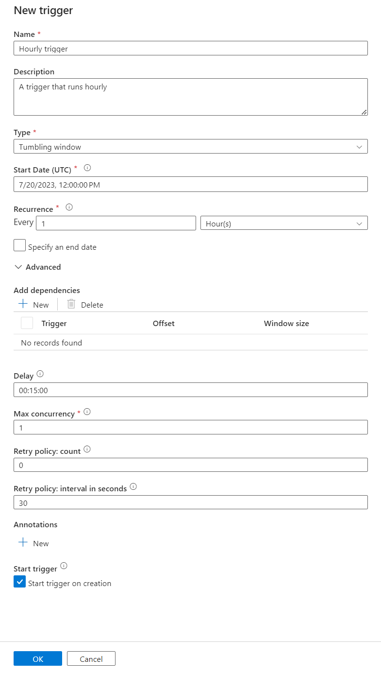In this example, a tumbling window trigger is used to periodically run the pipeline given a starting point and regular time interval. For more information about triggers, see Pipeline execution and triggers in Azure Data Factory or Azure Synapse Analytics.